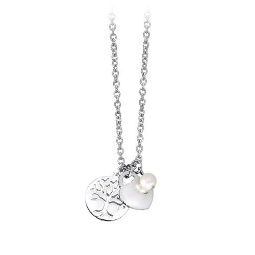 Collana donna in acciaio 316L. Catena maglia rolò. Lunghezza cm 45 con possibilità di messa a misura fino a cm 40. Perla pendente coltivata, diametro mm 4. Cuore pendente in acciaio 316L cm 1,5. Albero della vita pendente cm 2.