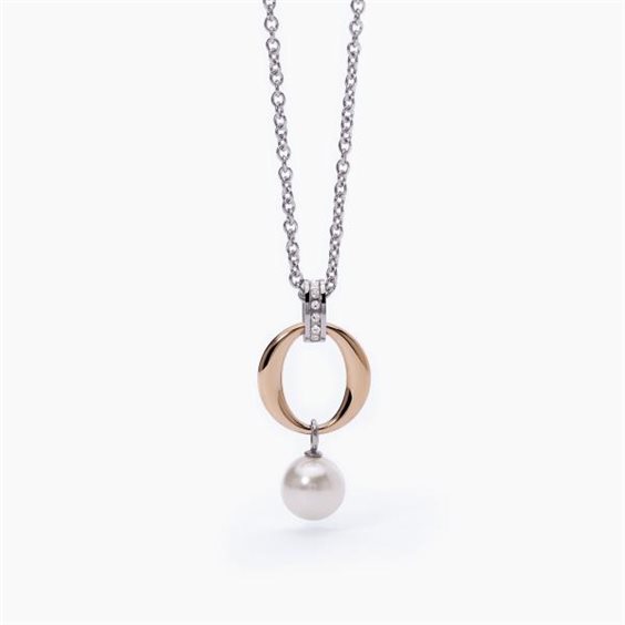 Girocollo in acciaio 316L e PVD Rosé con catena forzatina 2.3 mm, perla conchiglia Ø 10 mm, cristalli Ø 1.5 mm e pendente tondo Ø 18 mm, lunghezza regolabile da 40 a 45 cm.