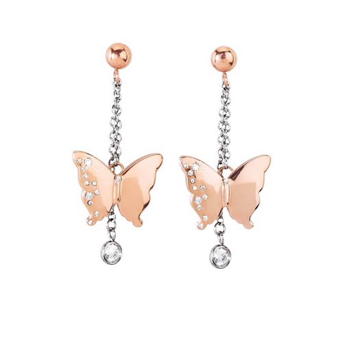 Orecchini donna in acciaio , farfalla pendente lunghezza cm 4 , cristalli bianchi , finiture in PVD oro rosè.