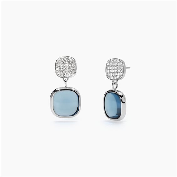 Orecchini in acciaio 316L con elementi taglio quadrato, glass azzurro 14x14 mm e cristalli bianchi Ø 1.5 mm, lunghezza totale orecchino 2.8 cm