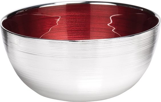 Ciotola in vetro SINFONIA 21cm - ROSSO Linea SINFONIA di Argenesi. Questa ciotola è completamente realizzata in vetro. La superficie esterna è stata ricoperta in puro Argento 999 risultando lucida al tatto ed alla vista. La sua parte interna invece è stata sapientemente decorata a mano dai nostri artigiani, che per questo prodotto hanno utilizzato una finitura di color rosso.