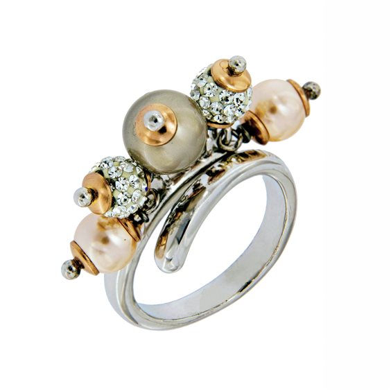 Anello Boccadamo con ciondoli, perla rosa, grigia e sfere con cristalli swarovski. Anello aperto possibile regolarlo di una o due msiure in più.