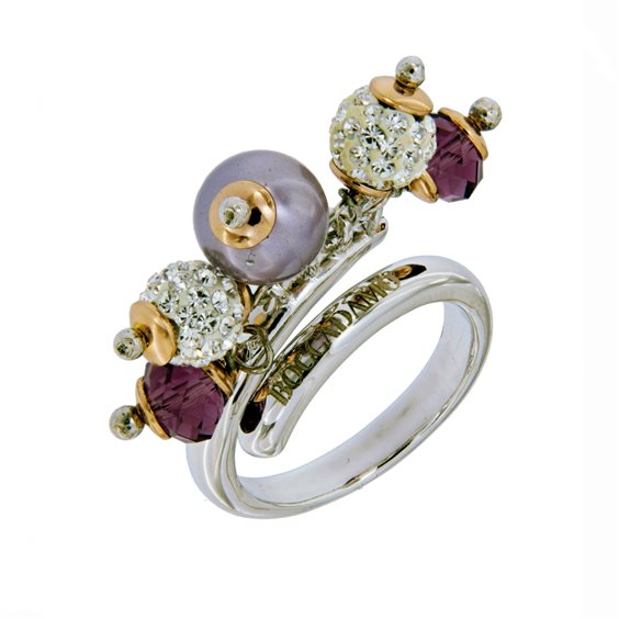 Anello Boccadamo in argento 925 con ciondoli: perla viola, criastalli Swarovski viola e sfere ricoperte di crsitalli Swarovski bianchi. Anello aperto possibile allargarlo di una o due misure.
