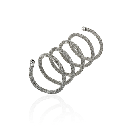Maglia in acciaio lucido, modellabile nell'indosso, con terminali personalizzati in acciaio lucido con trattamento IP rose. New Snake è un gioiello unico: leggero e flessibile, è caratterizzato da una preziosa maglia metallica in cui scorre un'anima morbida e malleabile, che disegna spire e giochi di luce tutti da modellare. Nelle foto si posso vedere gli utilizzi sia come collana che come bracciale, cavigliera o cintura.