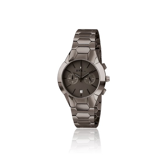 CHRONO LADY 38,5MM. Movimento Miyota OS21. W.R. 5 atm. Cassa in acciaio lucido IP gun. Corona e pulsanti IP gun. Quadrante gun lucido. Contatori gun con effetto satinato. Indici IP gun. Sfere IP gun con tecnologia luminescente. Datario. Vetro minerale con trattamento antiriflesso. Bracciale in acciaio lucido IP gun con sezione centrale satinata. Chiusura con pulsanti e fermaglio di sicurezza.