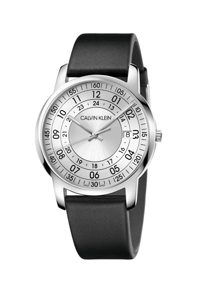 Orologio da uomo Calvin Klein City con movimento al quarzo Swiss Made, cassa tonda di grandi dimensioni, quadrante argento con doppia numerazione 24 ore e indicazione dei minuti, datario a ore 3, cinturino in pelle nera