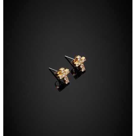 Orecchini a lobo a forma di croce con zirconi, placcati oro. Croce: 7x9x2 mm (LxAxP)
