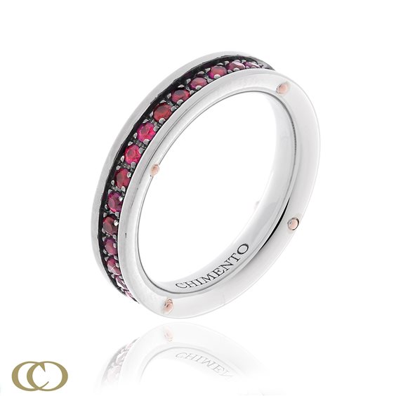Fediana oro bianco 18 Kt della linea Aeternistas di Chimento, impreziosita su tutta la circonferenza da rubini con caratura totale di 0,77. La taglia disponibile é 14, ma con la possibilità di procurare qualsiasi misura necessaria.