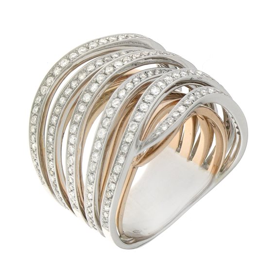 Anello fascia oro bianco e oro rosa 18 Kt, appartenente alla linea Anima di Chimento, con inserti di diamante taglio brillante con caratura totale di 1,09. L'anello é in misura 14, ma con la possibilità se necessario di messa a misura.