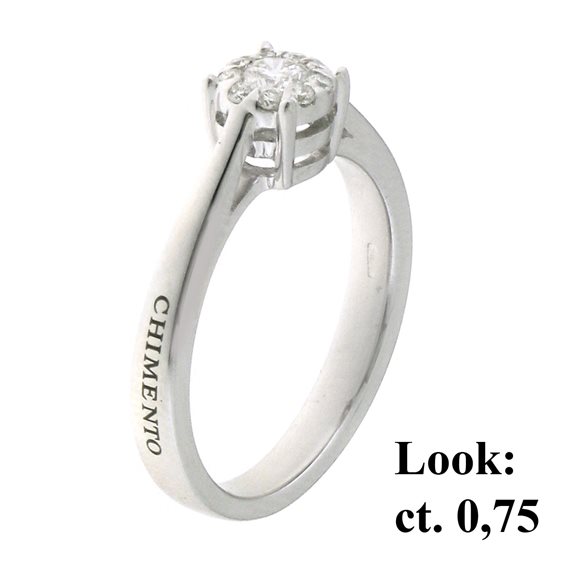 Anello oro bianco 18 Kt della linea Bouquet di Chimento; il centrale multipietre é formato da diamanti bianchi taglio brillante con caratura totale di 0,25. La taglia disponibile é 14, ma con la possibilità di messa a misura se necessario.