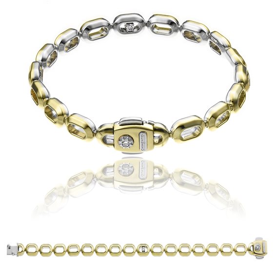 Bracciale oro giallo 18 Kt e oro bianco Kt appartenente alla linea Double di Chimento, impreziosito da un diamante bianco taglio brillante sulla chiusura. La particolarità di questa linea, e quindi di questo bracciale, é la possibilità di indossarlo sia dalla parte in oro giallo che dalla parte in oro bianco; due bracciali in uno!