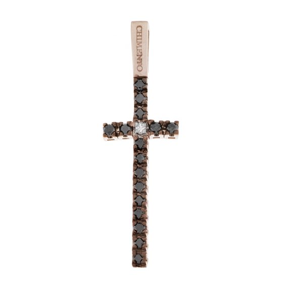 Ciondolo croce oro rosa 18 Kt della linea Croci di Chimento; impreziosito da 1 diamante bianco taglio brillante con caratura 0,01 e diamanti neri taglio brillante con caratura 0,26. Da abbinare ad una catena in oro rosa, ma anche in oro bianco, si presta per essere portato pure con un cordino.