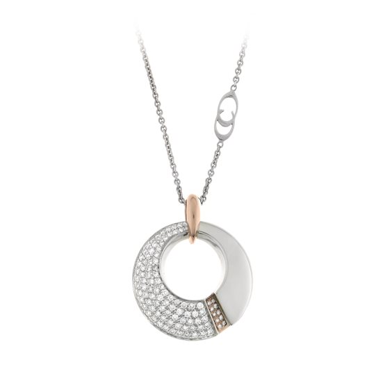 Girocollo oro bianco con piccolo inserto in oro rosa entrambi 18 Kt; appartenente alla linea Desiderio di Chimento é impreziosito da diamanti bianchi taglio brillante di caratura totale 0,79. La misura della catena in oro bianco é di cm 45.