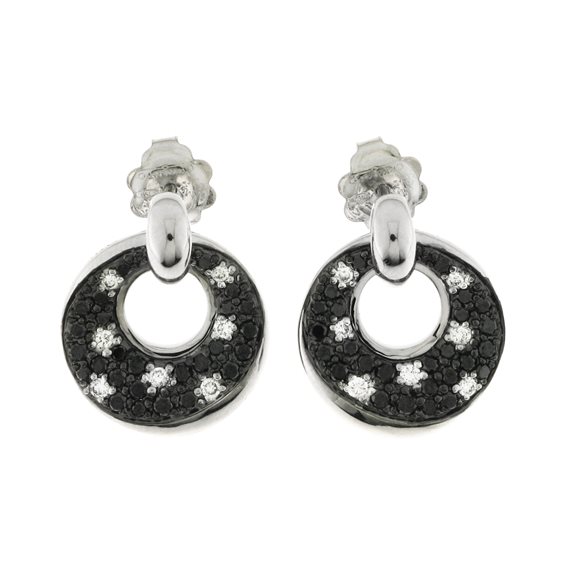 Orecchini in ora bianco 18 Kt appartenenti alla linea Preziosa di Chimento, con inserti in diamanti bianchi taglio brillante con caratura di 0,17 e diamanti neri taglio brillante con caratura di 0,73. Nonostante la classica forma a cerchio hanno un design giovane e moderno, portabili in qualunque occasione visto la leggera pendenza.