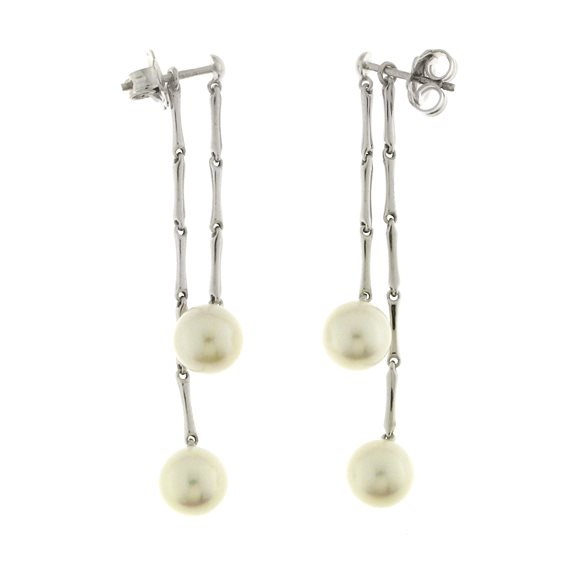 Orecchini oro bianco 18 Kt con perle fresh water (diametro 7 - 7,5). Può essere indossato in due modi diversi (in quanto il pendente più lungo può essere rimosso): - con il pendente più corto che è fisso ( lunghezza 4 cm); - con entrambi i pendenti (lunghezza 5 cm).