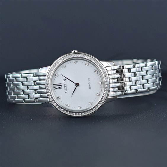 orologio solo tempo donna della Collezione Lady Collection. movimento Eco-Drive (a carica Luce) con riserva di carica di 6 mesi con funzione ore-minuti.Vetro Zaffiro. Quadrante bianco con cristalli, lancette lucide. Cassa in acciaio Lucido Ø 30mm impreziosita da cristalli incastonati nella lunetta, uno straordinario effetto di luce brillante ed eleganza. Bracciale regolabile in acciaio lucido con maglia tipo panther e chiusura déployante con pulsanti. Impermeabile 5 bar (50 metri).
