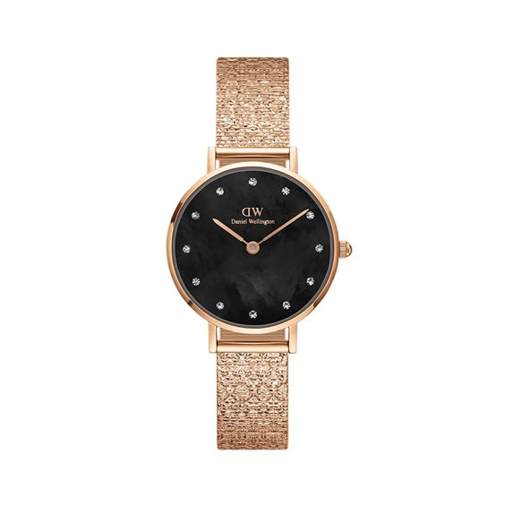 Orologio Daniel Wellington Petite Lumine solo tempo al quarzo da donna, diametro 28mm, spessore 6,5mm, peso 34gr. Vetro minerale, quadrante madreperla nera con cristalli, cassa acciaio PVD oro rosa 3atm, bracciale maglia milano acciaio pressed PVD oro rosa.