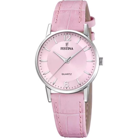 Orologio Festina. Cassa in acciaio mm 29 e cinturino in pelle rosa. Quadrante rosa con indici e lancette argento. Movimento al quarzo e vetro minerale. Impermeabilità 5 atmosfere.
