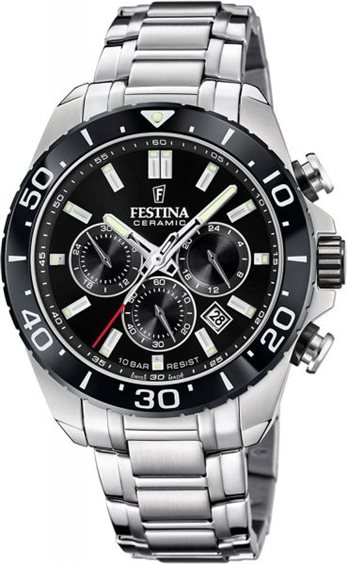 Orologio Festina Swiss Made Collection cronografo al quarzo da uomo, diametro 44mm, spessore 12,5mm, peso 172gr. Vetro zaffiro, quadrante nero, cassa acciaio lunetta ceramica nera 10atm, bracciale acciaio.