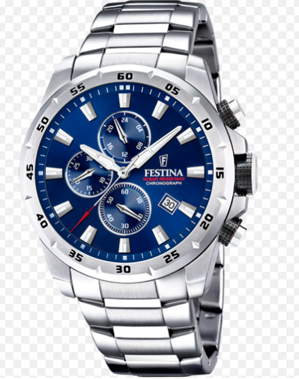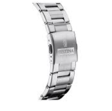 Cronografo al quarzo Festina. Cassa (mm 45) e cinturino in acciaio 316L. Corona e pulsanti con finitura nera. Quadrante blu con indici applicati che si illuminano al buio. Vetro minerale piatto. Fondello a vite con possibilità di incisione. Impermeabilità 10 atmosfere. IN CASO DI INCISIONE NON SARA' POSSIBILE IL RESO.