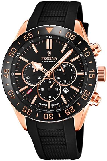 Orologio uomo, movimento cronografo al quarzo MOS20, quadrante nero, datario, cassa in acciaio 316L finitura in PVD rosé, vetro minerale, ghiera in ceramica, fondello a vite, corona a vite, cinturino in silicone dedicato nero.