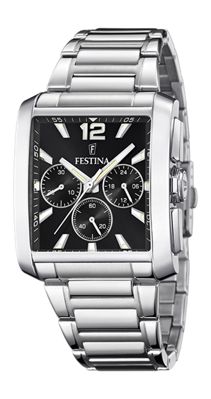 Orologio Festina Timeless Chronograph cronografo al quarzo da uomo, rettangolare diametro 38mm, spessore 13mm, peso 169gr. Vetro minerale, quadrante nero, cassa acciaio 5atm, bracciale acciaio.