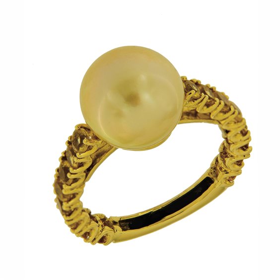 Anello Giampiero Fiorini in oro giallo 18kt con perla australiana gialla 12,1mm e quarzi citrini sul gambo per 2,3ct