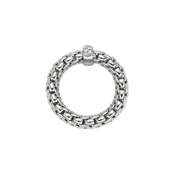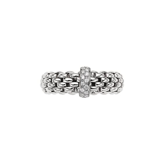 misura M (taglie dalla 14 alla 17) - Anello Fope Flex’it collezione Vendome in Oro Bianco 18 carati. Larghezza 7 mm, spessore 4 mm. Al centro una barra fissa di larghezza 3 mm e lunghezza 9 mm con diamanti per un totale di 0,10 carati. Le maglie sono elastiche grazie alla tecnologia Flex’it brevettata Fope, con piccole molle in oro nascoste lungo la maglia che permettono di indossare l'anello in varie misure.