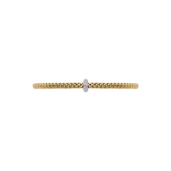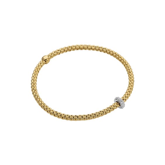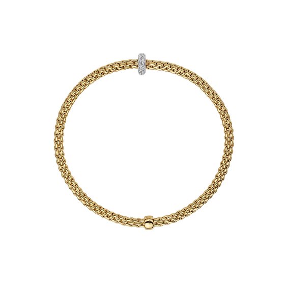misura M (cm 17) - Bracciale Fope Flex’it collezione Prima, in Oro Giallo e Oro Bianco 18 carati. Elemento centrale formato da un anello impreziosito da diamanti bianchi per un totale di 0,18 carati. Lo spessore del bracciale è di 3 mm, mentre l'altezza dell'elemento centrale è di 7 mm. È presente una barra fissa in oro giallo con inciso il marchio Fope. Le maglie piatte dell'anello sono state sottoposte ad uno stress test di 12.000 trazioni per garantirne la qualità. Le maglie sono elastiche grazie alla tecnologia Flex’it brevettata Fope, con piccole molle in oro nascoste lungo la maglia. Questo permette una vestibilità comoda e adattabile senza necessità di chiusure.