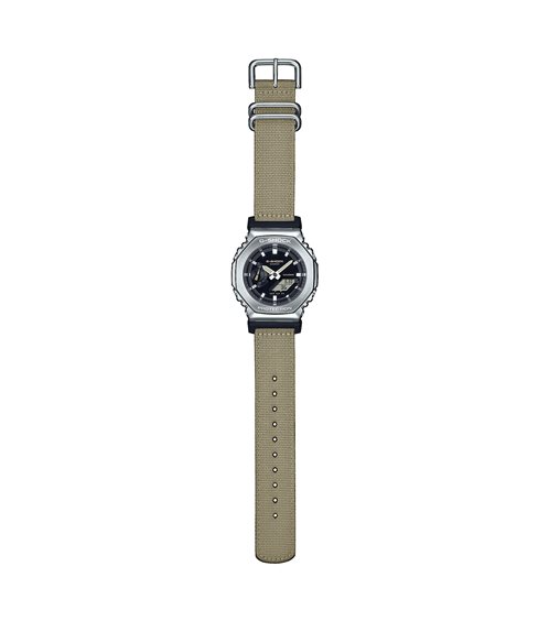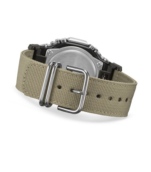 Orologio Casio G-Shock cronografo al quarzo da uomo, diametro 44,4 mm, spessore 11,8mm, Peso 72gr. Vetro minerale, quadrante nero e display positivo, cassa resina, carbonio e acciaio 20 atm, cinturino tessuto beige.