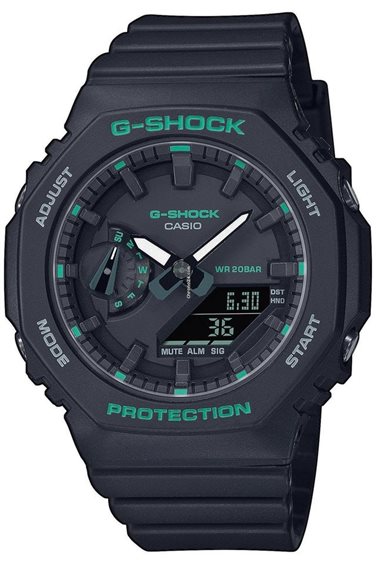 Scegli l'eleganza e il comfort del modello GMA-S2100 analogico-digitale più sottile e compatto, caratterizzato da moderni dettagli verdi. La superficie piatta e i semplici indici a barre si uniscono in un design lineare e soddisfacente. Un tocco originale in verde nei dettagli come il logo, gli indici a barre e il display LCD rende questo orologio l'accessorio perfetto per uno stile street.