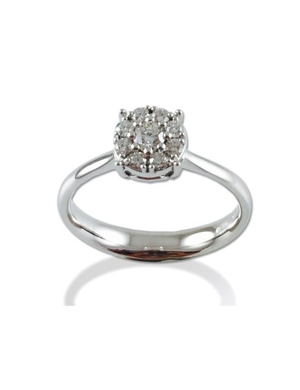 Solitario multipietra Gemoro in oro bianco 18kt impreziosito da 1 diamante bianco centrale con caratura 0,12 (colore G e purezza Vs) e diamanti bianchi di contorno con caratura 0,18 (colore G e purezza Si). La misura disponibile é 14.