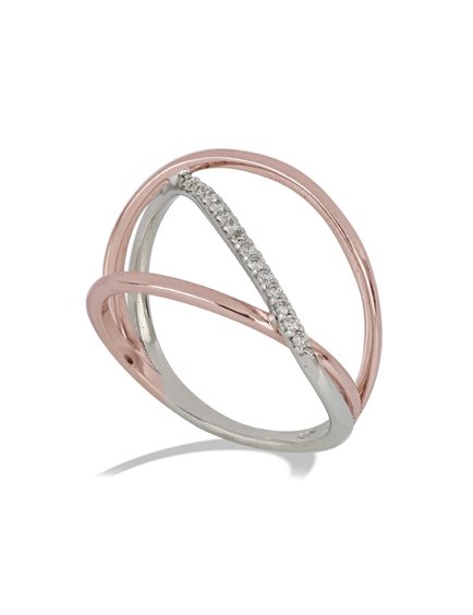 Anello Gemoro della linea Onde in oro bianco e rosa 18kt impreziosito da diamanti bianchi con caratura di 0,11 (colore G e purezza Si). La misura disponibile é 14.