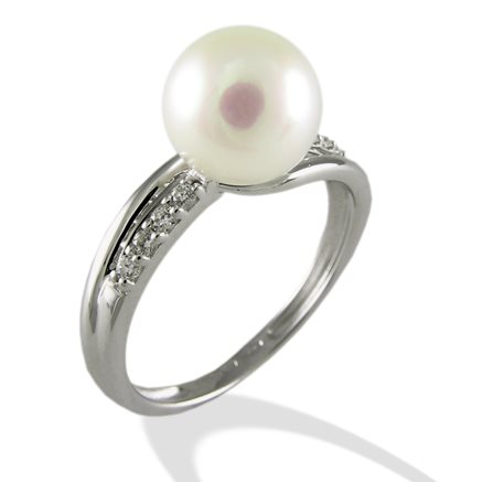 Anello oro bianco 18 Kt, impreziosito sul centrale da 1 perla bianca fresh water di diametro 8/8,5 mm e da 8 diamanti bianchi con caratura di 0,10 (colore H e purezza Si). La misura disponibile é 12.