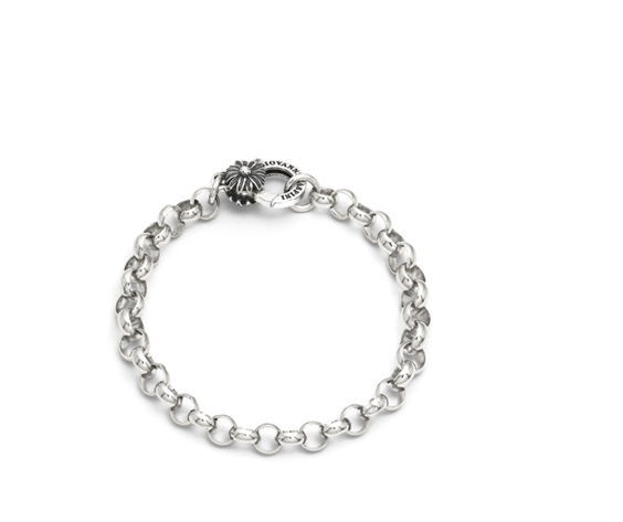BRACCIALE ROLO' CHIUSURA MARGHERITA. Questo raffinato bracciale in argento brunito si distingue per la sua pregiata lavorazione artigianale. Il motivo margherita, un evergreen della Maison Giovanni Raspini, in versione double face con funzione di chiusura-decoro, impreziosisce il design, combinandosi armoniosamente con la catena a maglia ovale in argento. Realizzato a mano in azienda.