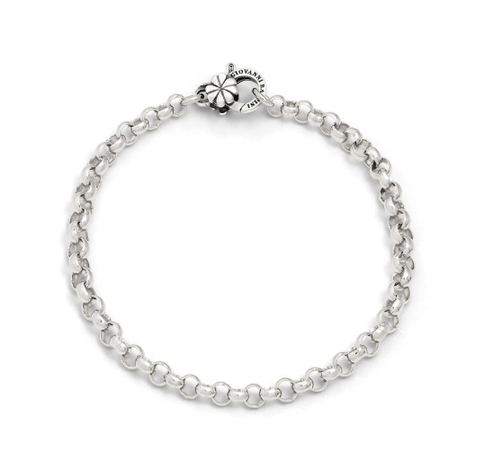 BRACCIALE ROLO' PICCOLO CHIUSURA QUADRIFOGLIO Questo raffinato bracciale in argento brunito si distingue per la sua pregiata lavorazione artigianale. Il motivo quadrifoglio, un evergreen della Maison Giovanni Raspini, in versione double face con funzione di chiusura-decoro, impreziosisce il design, combinandosi armoniosamente con la catena a maglia ovale in argento. Realizzato a mano in azienda.