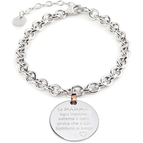 Bracciale in argento bianco con medaglia pendente centrale con frase : "la MAMMA ogni mattina sistema il cielo prima che il suo bambino si svegli". La catena del bracciale classica rolò è dotata di catenella finale con cui si può adattare la misura su ogni tipo di polso, da 19 a 16 cm. Questo bracciale, grazie alla dolcissima frase che lo caratterizza, è un regalo perfetto per una neomamma o per la festa della mamma.