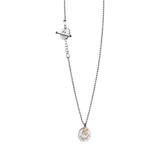 Collana boule da 2 mm, charm medaglia HAPPY con Quadrifoglio oro rosa 9 carati. Chiusura a T. Lunghezza 38 cm. MATERIALE: ARGENTO 925/1000 + ORO 375/1000 (9kt).