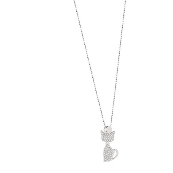 Collana lunga sottile a pallini circa 80 cm in argento bianco con piccolo ciondolo centrale a forma di gatto, interamente rivestito e reso luminoso da zirconi bianchi. Design moderno ed elegante Regalo adatto per una donna o una ragazza che ama i gatti.