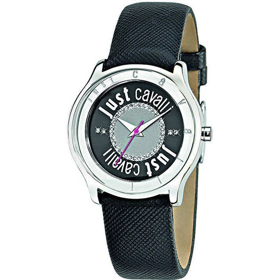 Orologio Just Cavalli Milady da donna; diametro 34mm; quadrante nero protetto da vetro minerale bombato; cassa in acciaio tonda; cinturino in pelle nero.
