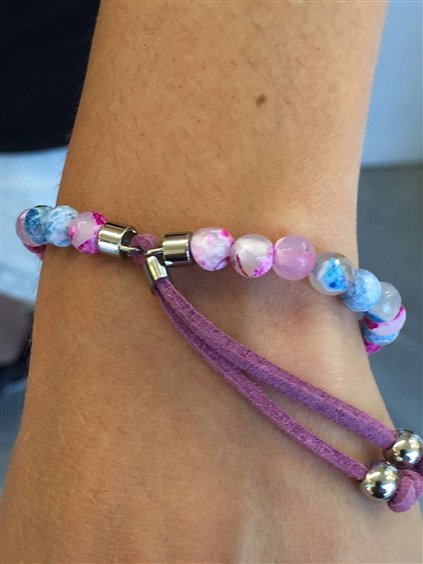 Bracciale in acciaio 316L con agata multicolor, lunghezza regolabile da 16 a 19 cm e Ø 6 cm. Dimensioni: sfere Ø 6 mm