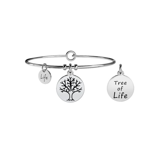 Bracciale Kidult in acciaio ipoallergenico con ciondolo rotondo con albero della vita. " Rami che seguono la forma del vento, chiome che tendono all'infinito. Le sue radici sono l'anima del futuro, al suo interno scorre linfa che genera vita. Il collegamento profondo tra l'uomo e la Madre terra."