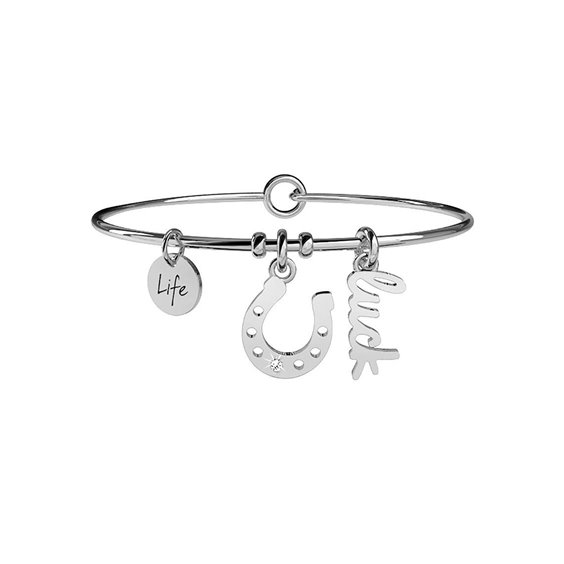 Bracciale bangle in acciaio 316L, circonferenza 20 cm, Ø 6 cm con ciondolo ferro di cavallo, ciondolo luck, cristallo bianco. Dimensioni: ciondolo ferro di cavallo 13.50x14.50 mm, ciondolo luck 9x14.50 mm, cristallo Ø 1.50 mm