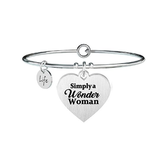 bracciale Kidult in in acciaio ipoallergenico con ciondolo a forma di cuore con scritta "Wonder woman" "Attenta, dolce e affettuosa. Ma anche forte e decisa, sempre pronta ad aiutare gli altri. sei un esempio di positività e tenacia, una super donna che non si ferma mai"