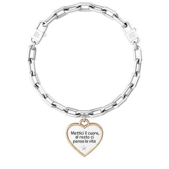 Il bracciale da donna Kidult 731946 della Collezione Life Philosophy è realizzato in acciaio 316L e Pvd oro rosa ed è composto da catena a maglie ovali "comfort fit" con pendente a forma di cuore satinato con rifinitura color oro rosa con scritta "Mettici il cuore, al resto ci pensa la vita" ed impreziosito da cristallo. Nella confezione di questo bracciale trovi un cartoncino che ne spiega il significato. La frase dice: Cuore/Passione "Mettici il cuore, al resto ci pensa la vita." Il sistema "comfort fit" permette facilmente di adattare in modo confortevole ed elegante il bracciale al tuo polso. Scegli la lunghezza della catena più adatta al tuo polso, agganciala ai due moschettoni e indossa il bracciale. Misura Small, lunghezza 16 cm; misura Medium, lunghezza 17,5 cm; misura Large, lunghezza 19 cm.