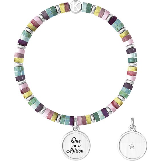 Bracciale elastico in acciaio 316L, con pietre multicolor, circonferenza 18.3-18.5 cm, ciondolo lucido e satinato. Scritta: One in a Million. Dimensioni: ciondolo Ø 15 mm, rondelle 4.5x2.5 mm