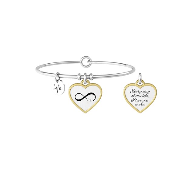 Bracciale bangle in acciaio 316L, circonferenza 20 cm, Ø 6 cm con ciondolo cuore satinato e in PVD giallo lucido, cristallo bianco. Scritta: Everyday of my…more. Dimensioni: ciondolo 19x19 mm, cristallo: 1.5 mm
