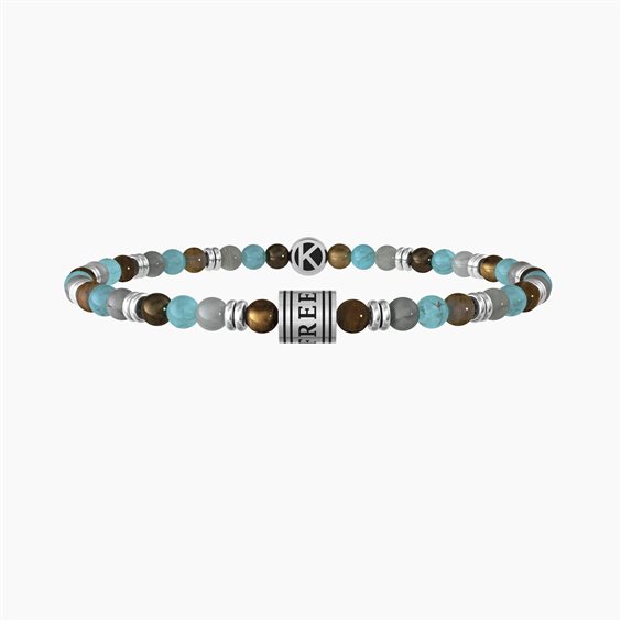 Bracciale elastico in acciaio 316L con pietre alternate multicolore, circonferenza 19.00-19.50 cm, rondella con PVD nero. Scritta: FREE SOUL. Dimensioni: rondella 7x6.5 mm, sfere Ø 4 mm