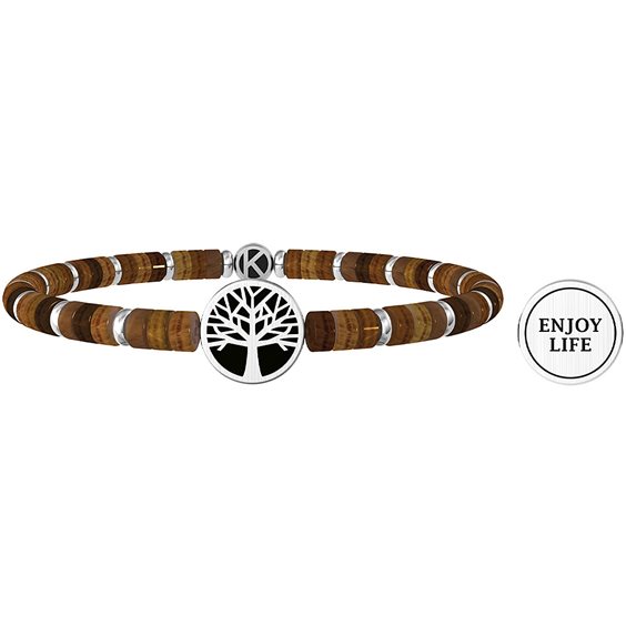 Bracciale elastico in acciaio 316L con occhio di tigre, lunghezza 18.30/18.50 cm e ciondolo albero della vita e PVD nero. Scritta: ENJOY LIFE. Dimensioni: ciondolo Ø 12 mm, dischetti 4.50x2.50 mm.