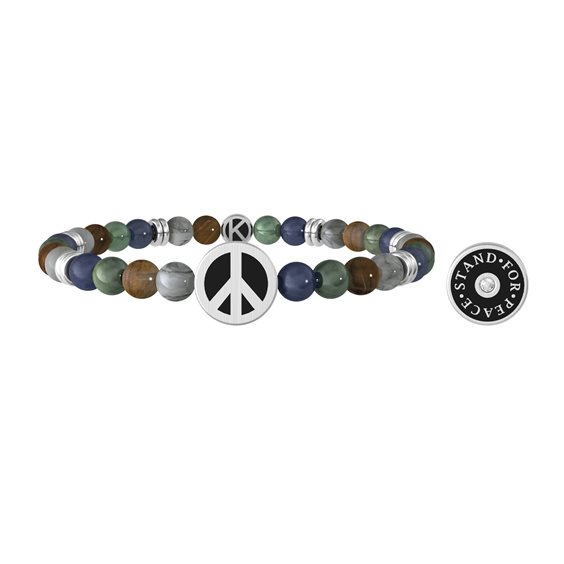 Bracciale elastico in acciaio 316L con pietre multicolor, circonferenza 19.50-19.80 cm, ciondolo con PVD nero, cristallo bianco. Scritta: STAND FOR PEACE. Dimensioni: ciondolo Ø 12 mm, sfere Ø 6 mm, cristallo Ø 2 mm